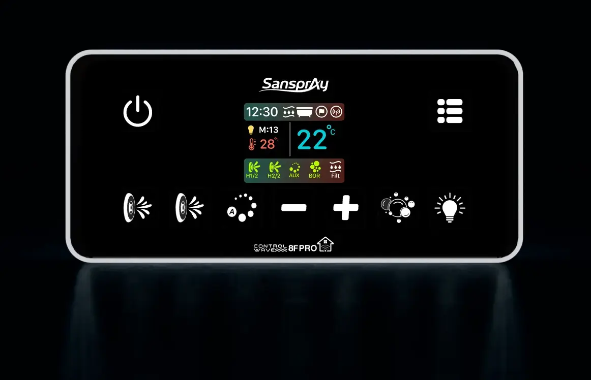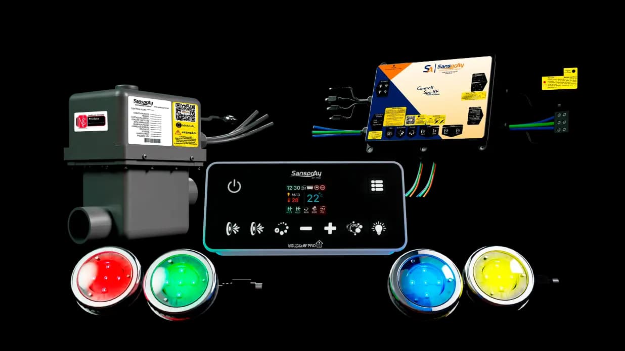 O sistema de cromoterapia do Aquecedor 8F Pro permite que você controle as luzes da sua banheira ou SPA. Você pode escolher entre diferentes cores terapêuticas para criar um ambiente relaxante e rejuvenescedor.